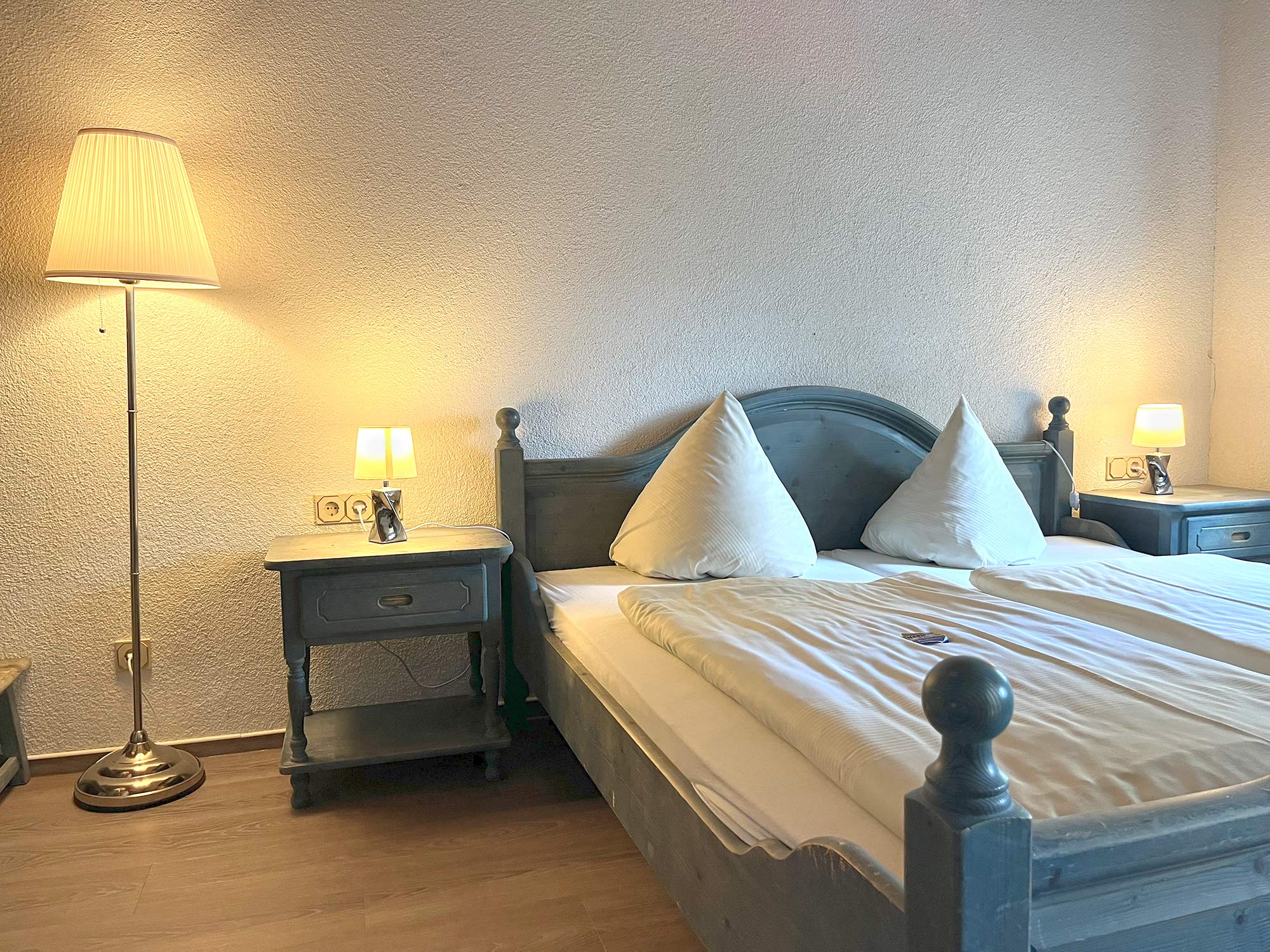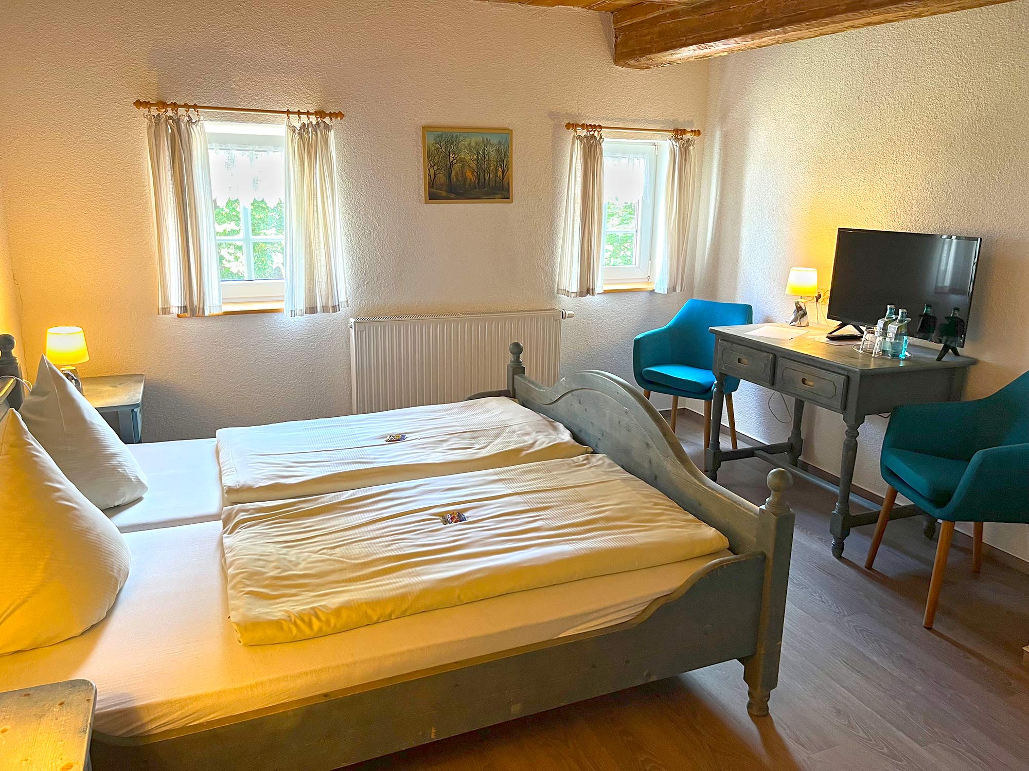 in der Regel mit 1 DZ und 2 EZ, mit 1 Badezimmer inkl. Dusche, WC, Fön, Einrichtung im Landhausstil, Fernsehen Begrüßungsgetränk auf dem Zimmer, kostenloses W-LAN in allen Räumen kostenlose Parkmöglichkeiten befinden sich bei uns im Hof.